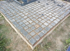 Заранее просыпав площадь места захоронения пескобетонной смесью начинаем строгими рядами укладывать брусчатку.